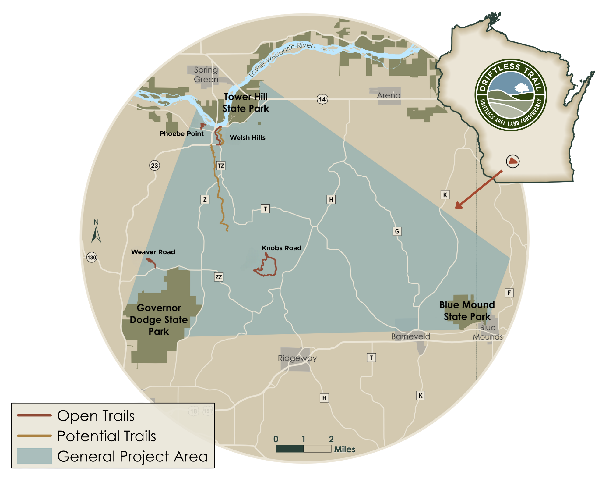 - Six miles north of Dodgeville. From Highway 23, turn east on County ZZ for 1.8 miles, then north on Weaver Road. The trailhead is on the northwest corner of this junction.